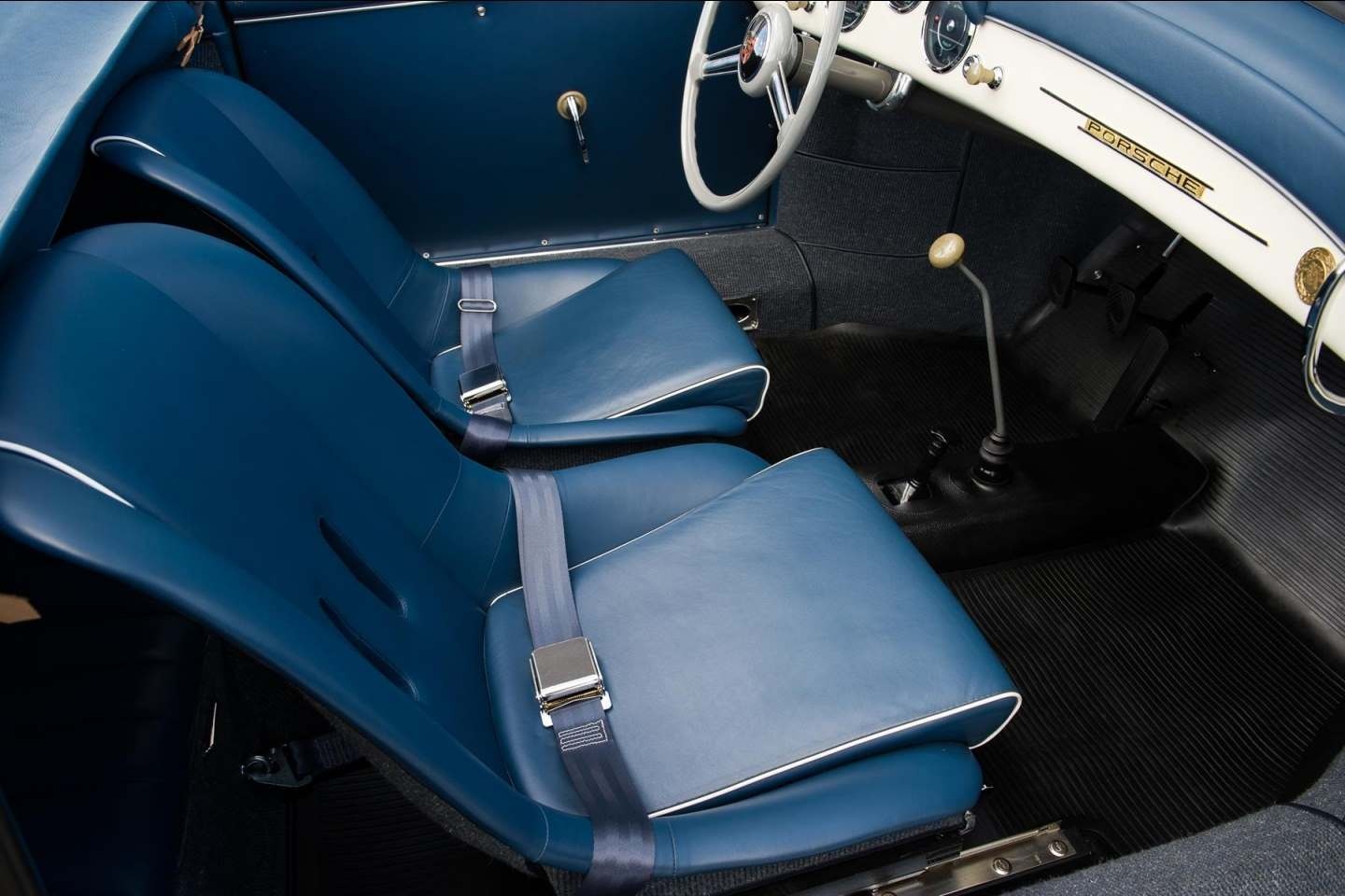 This superb matching numbers example was completed at the Porsche factory on the 26th of April 1957 and delivered to Hoffman Motors of New York, supplied in the stunning combination of White over a unique Blue Hide interior. At the time of production, leather was a rare option in a Speedster, rarer still, however, is the interior colour. Blue was not offered as a factory colour option, this example is the only known Speedster on the 356 registry with a full leather option. It was also fitted with the following options: Sealed Beam Headlights, USA bumpers, and a speedometer in Kilometres.