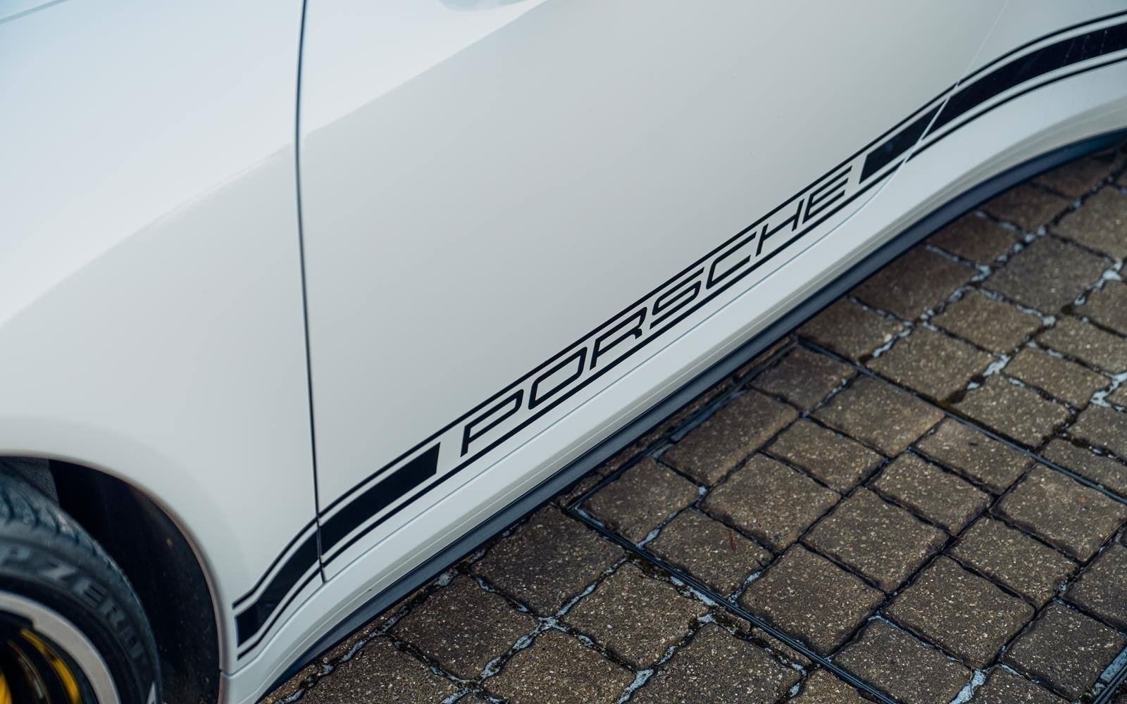 This significant and rare variant of 911 has been designed to incorporate the ageless styling of the 1974 3.0 Turbo, finished in Carrara White and featuring a bespoke black rear upper spoiler, bespoke “Fuchs” Sport Classic wheels in black, black finished exterior door handles, and the black Porsche script along the sills. The personalised carbon-fibre door sill guards with the words "911 Turbo S – Exclusive GB Edition" look stunning and to make this even more special it is illuminated signifying the true special edition nature of this model. Another special addition is the dashboard has been decorated with an embossed Union Jack flag and the words "911 Turbo S – Exclusive GB Edition".