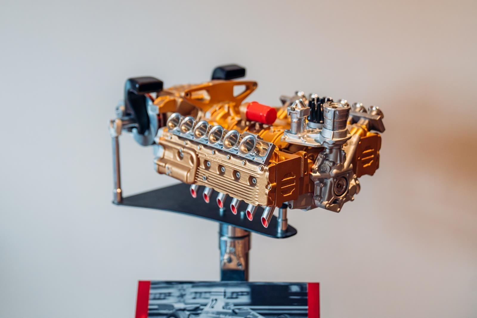 Using his factory connections, the process started by carefully dismantling a 312 T F1 engine in order to accurately take measurements to recreate in 1/3 scale. Recreated first by hand in wood, the engine was recreated and test fitted before casting and formation