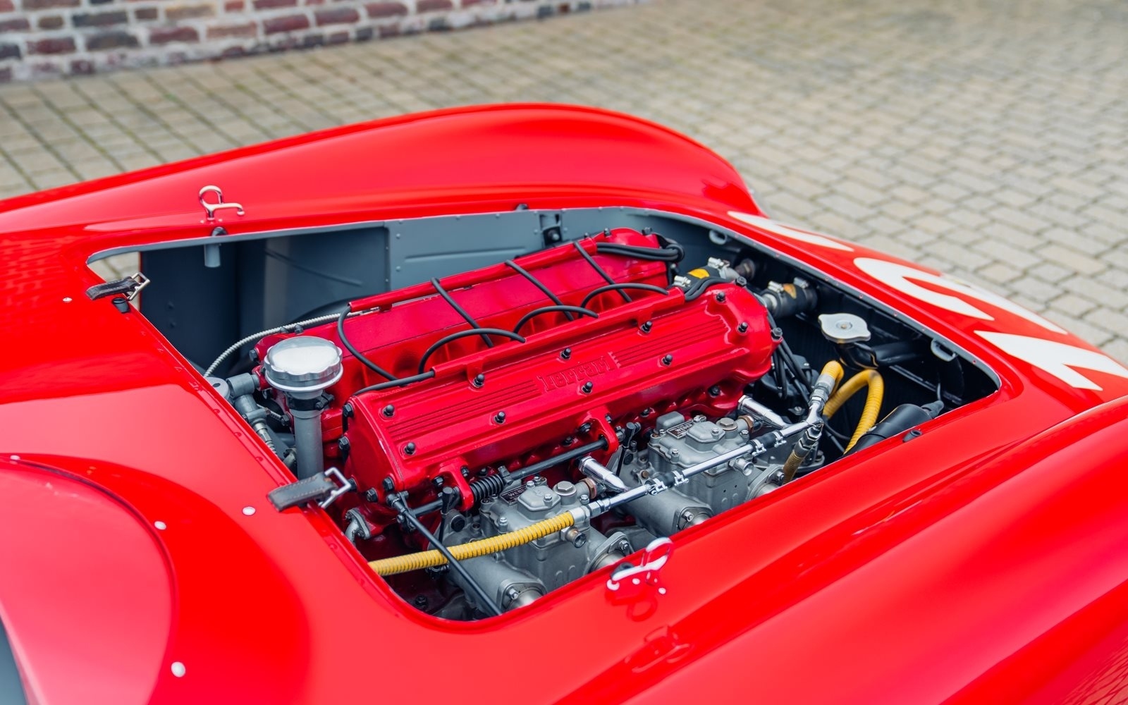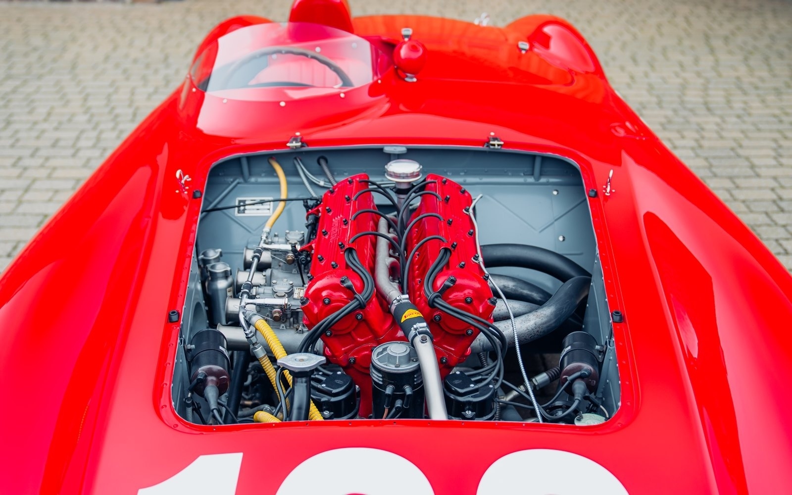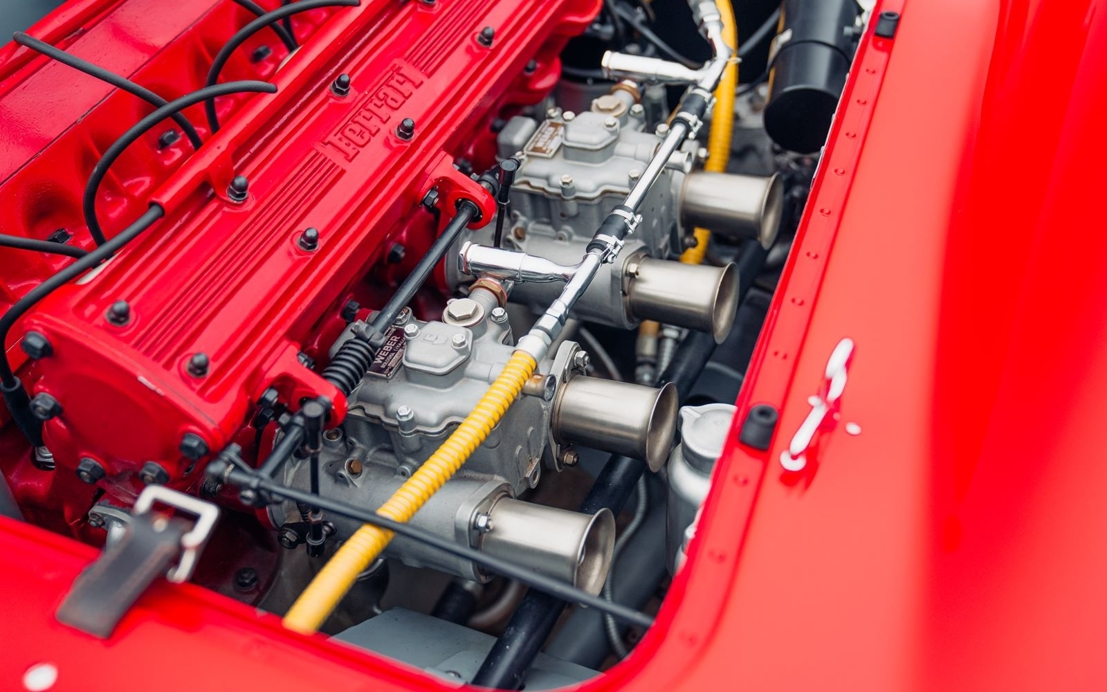 The over square 2-litre power unit had a bore and stroke of 90mm x 78mm, providing an actual total displacement of 1984.86cc, with a compression ratio of 8.5:1. The crankshaft ran in five main bearings, with the twin overhead camshafts driven by a train of gears also driving the oil pumps, water pump, distributors and dynamo. It featured the narrow 58deg angle two valves per cylinder head as used on the original 500 F2 design in 1951, whereas series II 500 Mondial and 750 Monza models had used a wider 85deg cylinder head. The narrower angle head was deemed to provide greater combustion efficiency. The induction and ignition systems comprised of a pair of side draught Weber 40 DCOA 3 carburettors fed by a mechanical pump with a back-up electric pump, and twin spark plug per cylinder ignition via a pair of timing cover-mounted distributors. Lubrication was dry sump with gear-driven pressure and scavenge pumps, supplied from a 15 litre oil tank.