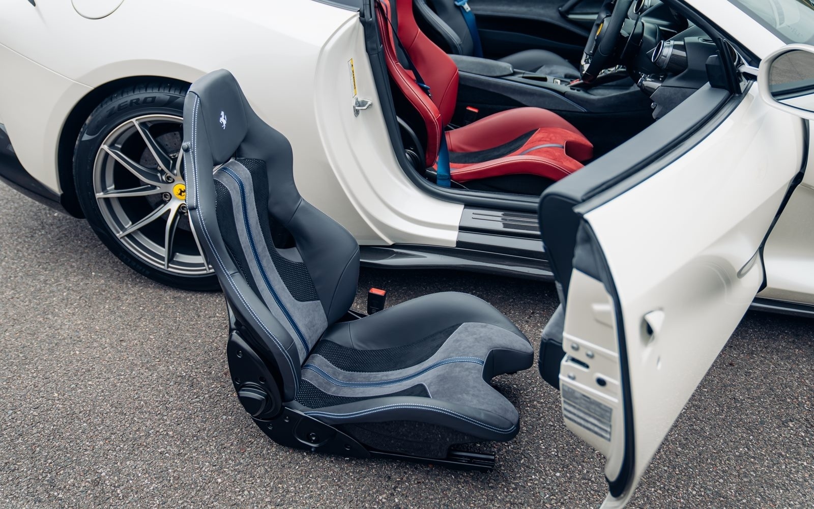 The car presents in the rare shade of Bianco Fuji; a triple layer paint offered from Ferrari’s exclusive extra-campionario palette. The pearlescent exterior is paired with a Charcoal leather and Alcantara interior. Colour aside, the asymmetrical seats are almost certainly the car’s most unique feature. In April 2022, at the cost of over £21,000, the current custodian requested that Ferrari supply an additional Carbon Racing Seat trimmed in Bordeaux Leather with a Blu Sterling central stripe. This unusual request was approved by the factory, and the new seat was subsequently installed by the supplying dealer, H.R Owen Ferrari, a month later. The installation of the seat completed the striking 'Tailor Made' inspired configuration in which the car presents today. Please note the original Charcoal leather seat accompanies the car.