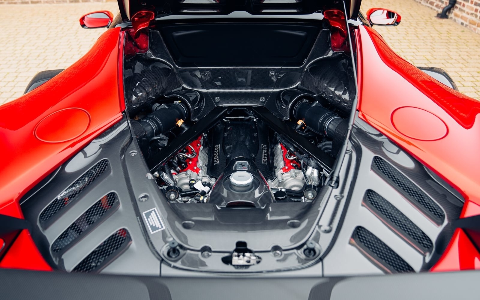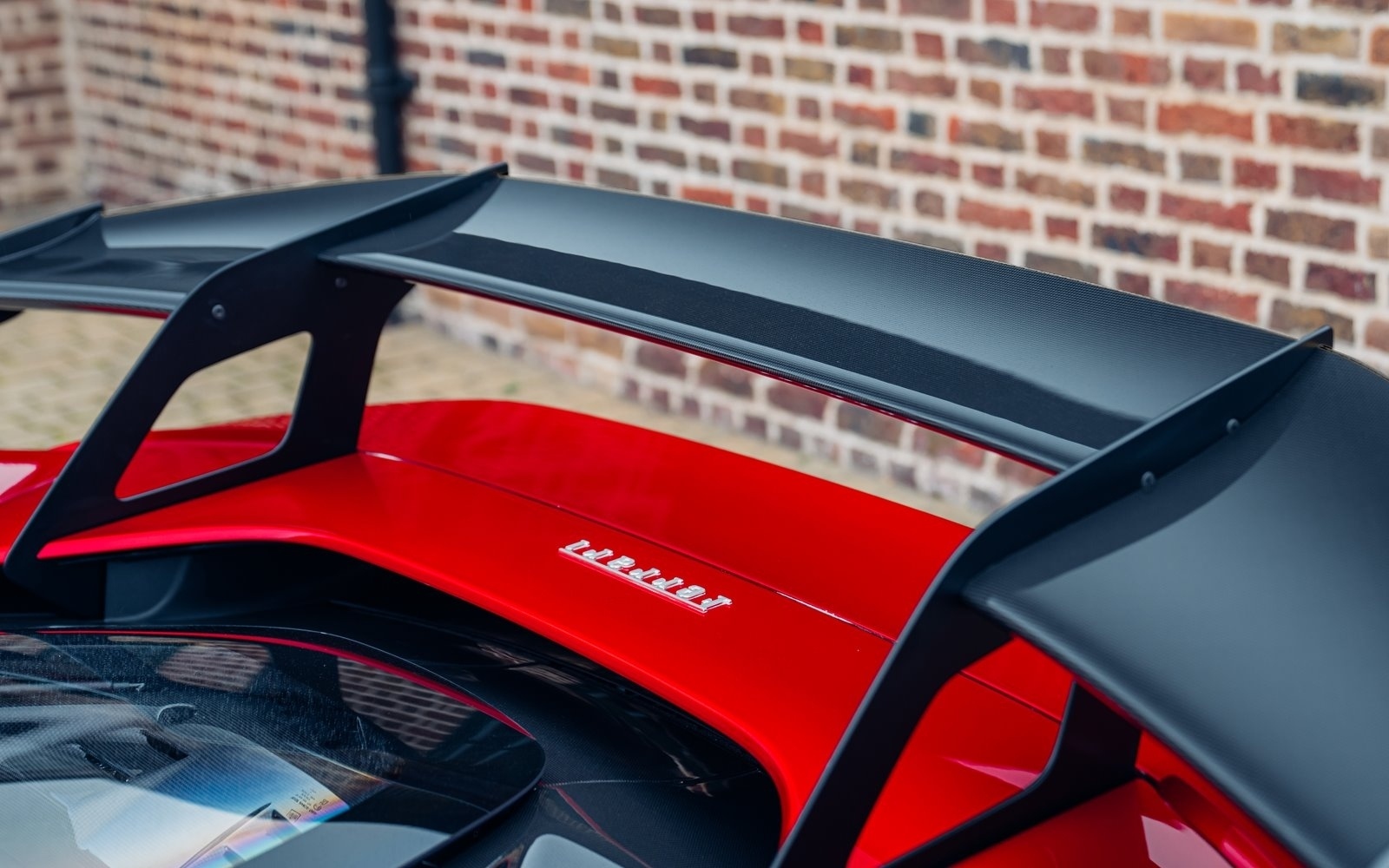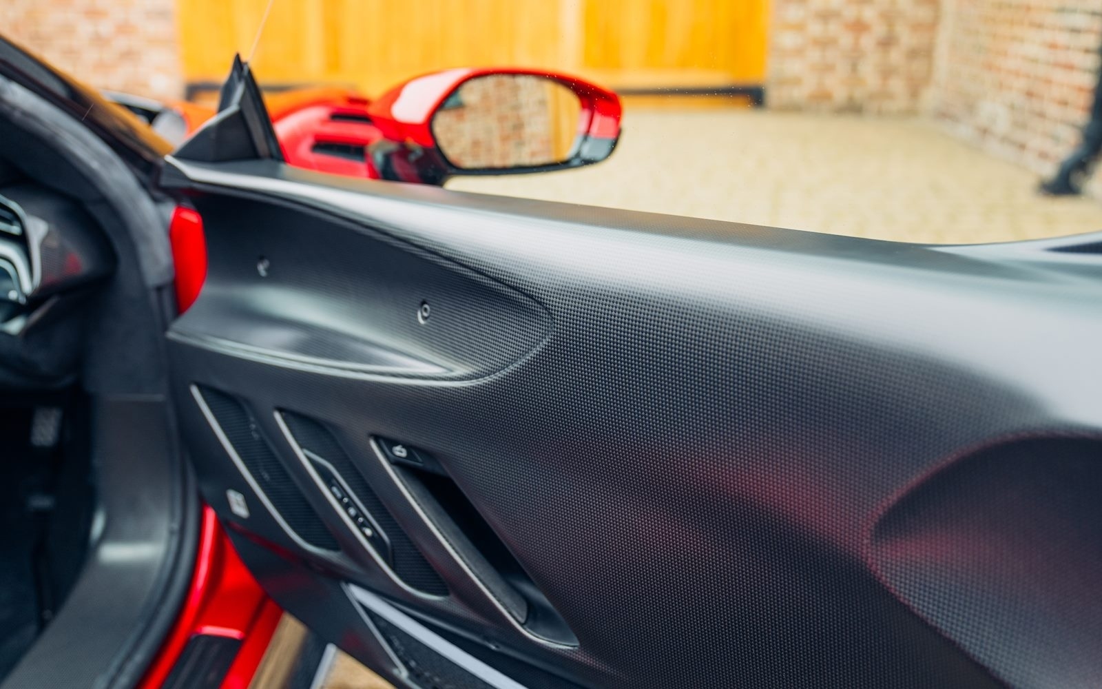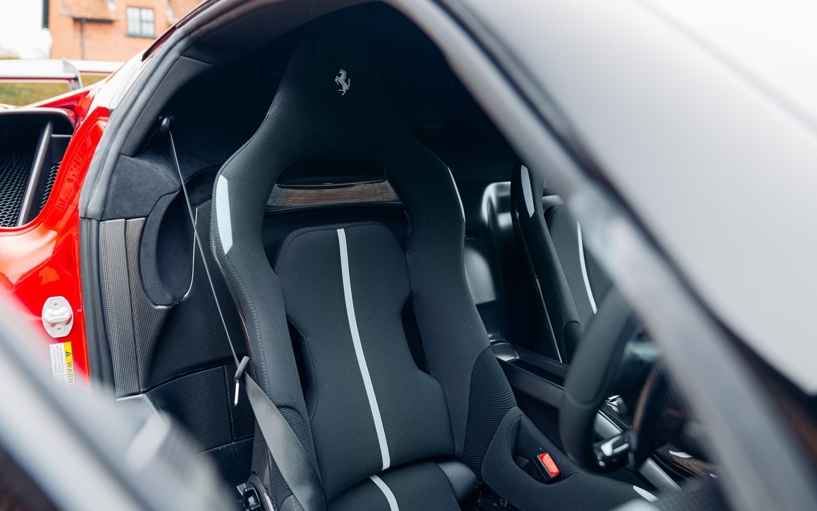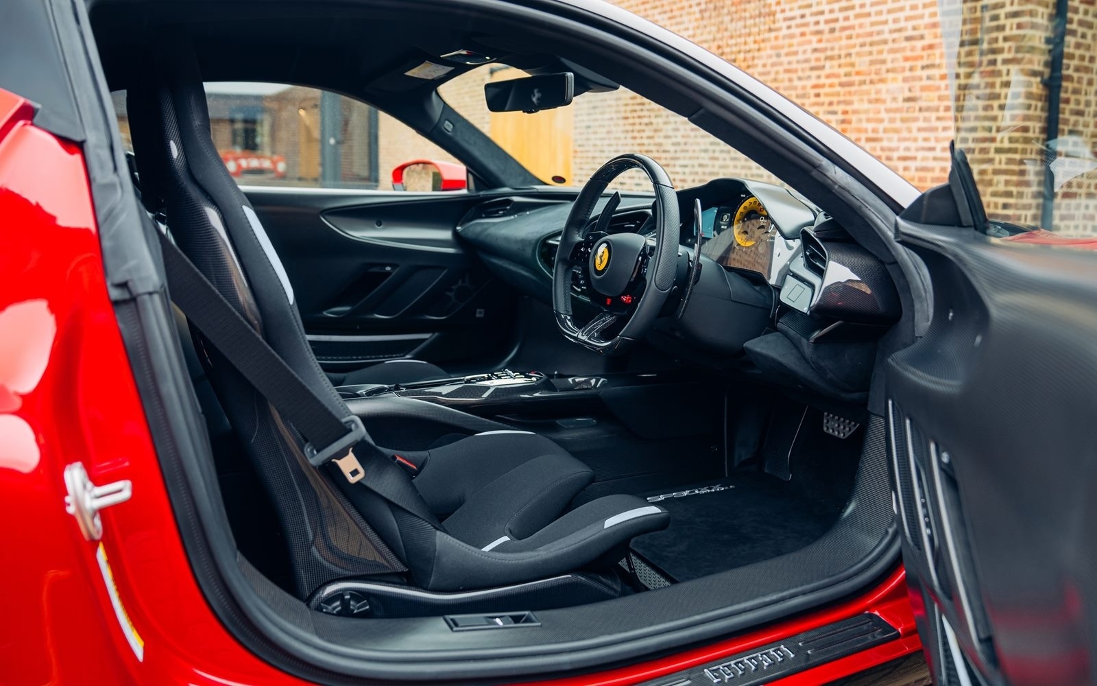 This example was supplied new in April 2025 and optioned in Rosso Magma, a four-layer colour launched on the 488 Pista. The exterior sees the optional upgraded carbon fibre wheels.