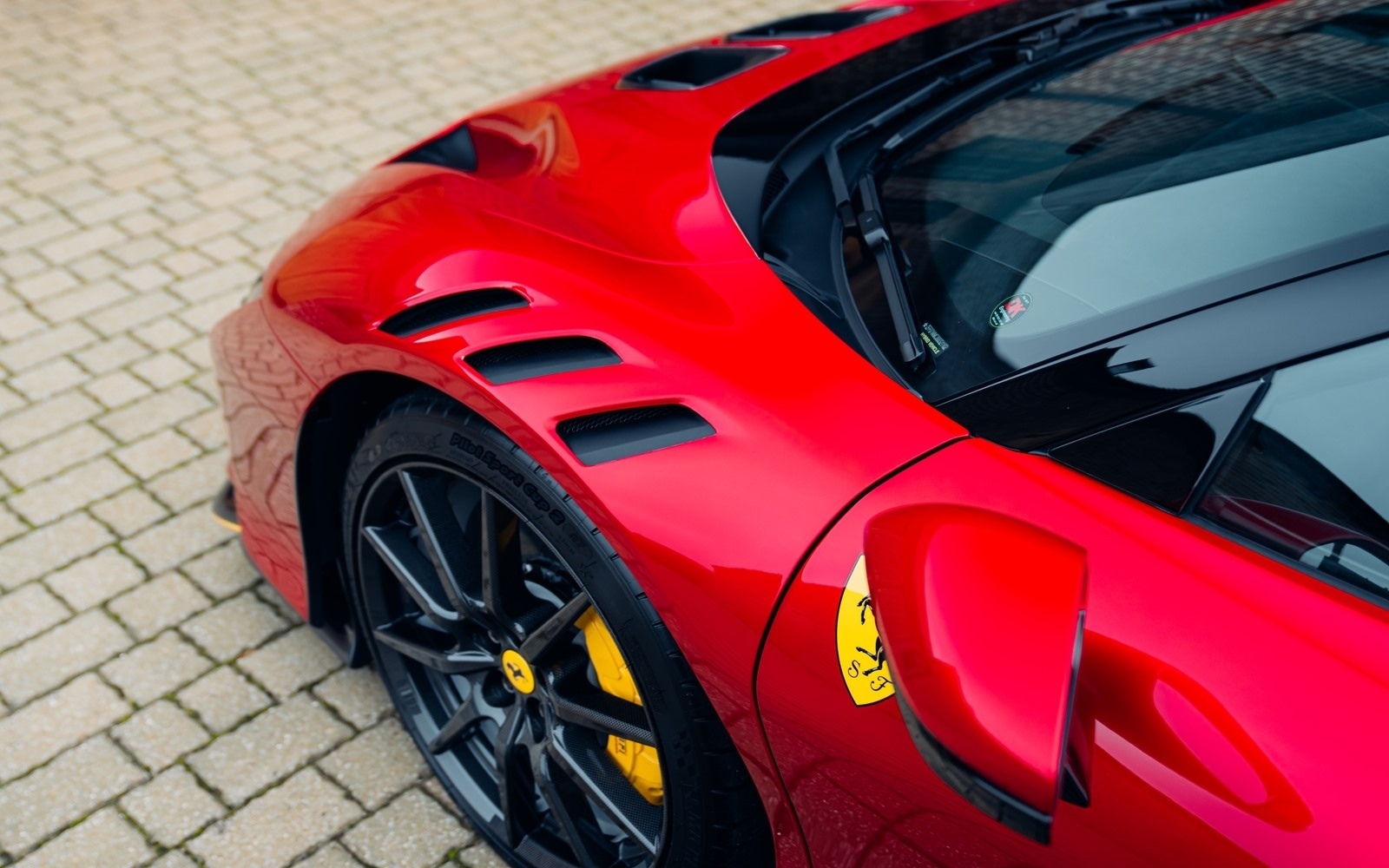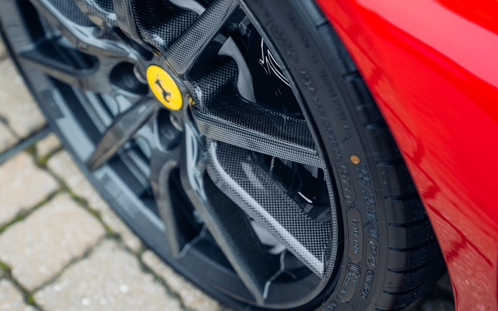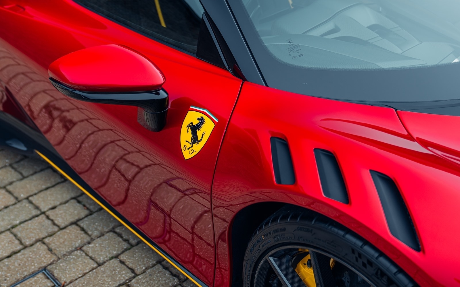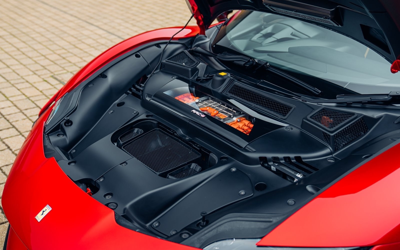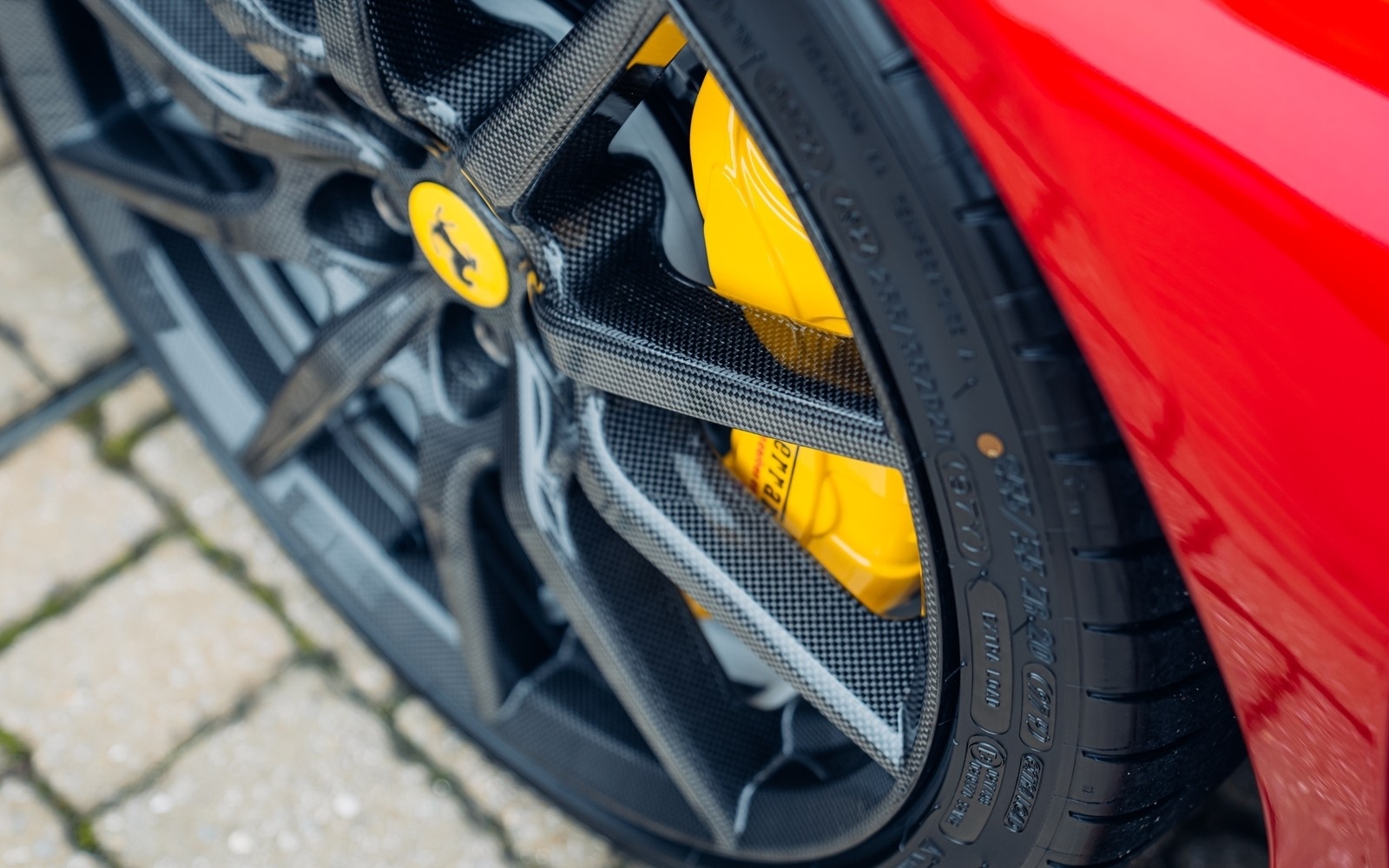 This example was supplied new in April 2025 and optioned in Rosso Magma, a four-layer colour launched on the 488 Pista. The exterior sees the optional upgraded carbon fibre wheels.