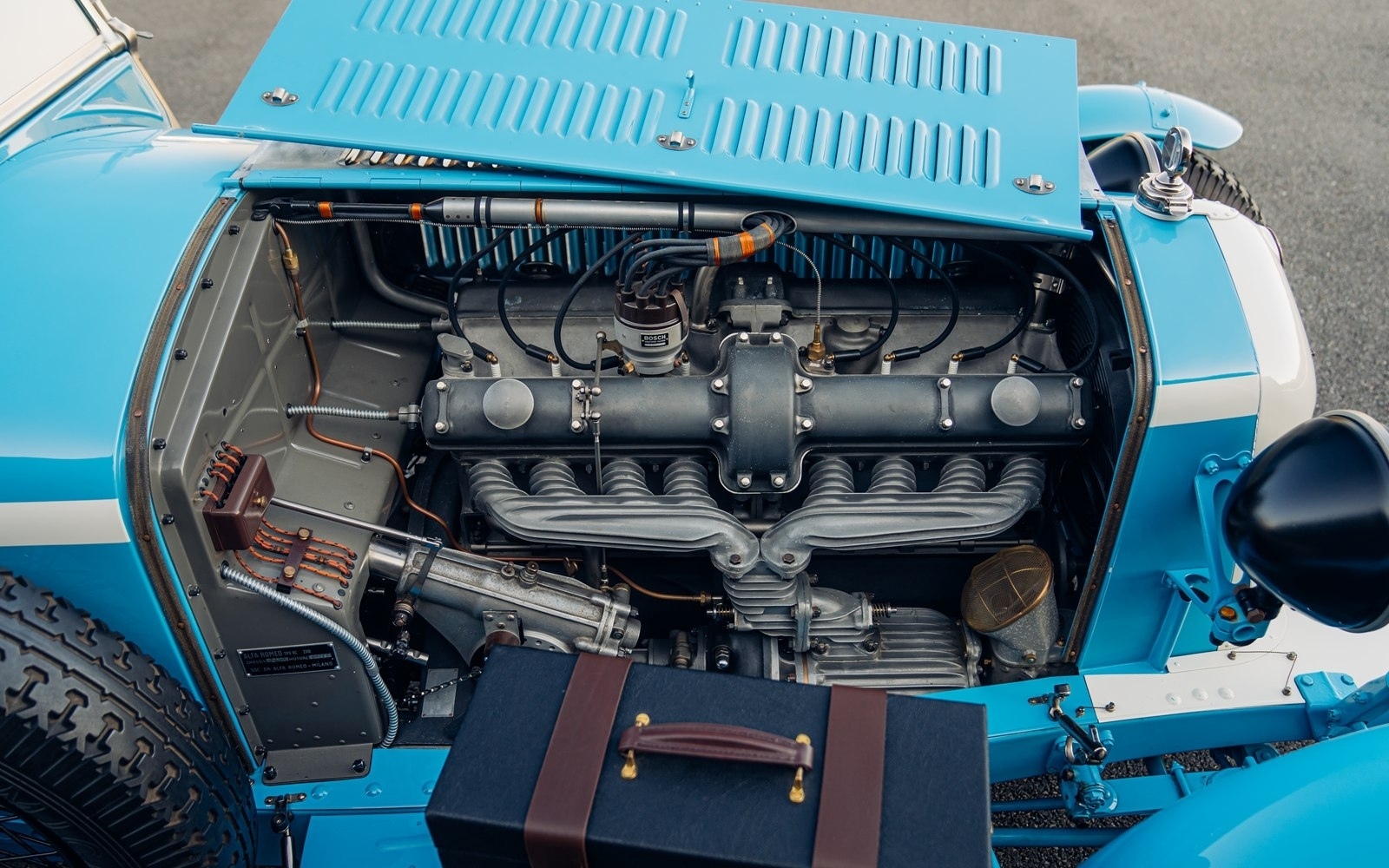 This engine is nestled around bodywork crafted over a two year period by The Design Cast Limited in New Zealand. Whilst others around the world are building 8C replicas, Colin Howard’s reputation for detail and authenticity sees him supplying owners of original cars with parts in lieu of those no longer available. Created over a two year period by hand and at a cost of just shy of £250,000, the 2300 Monza body today wears a wonderful pale blue inspired by that of Louis Chiron’s car in period.