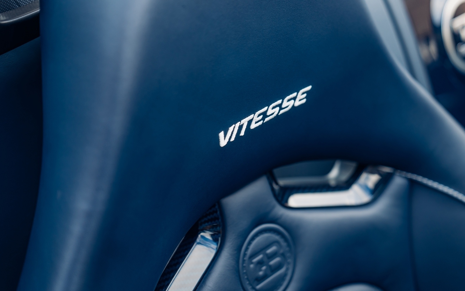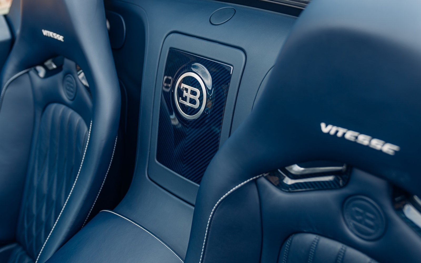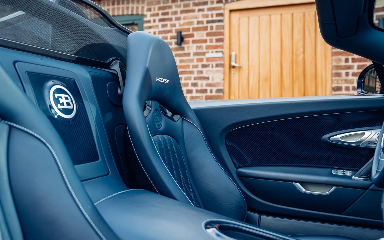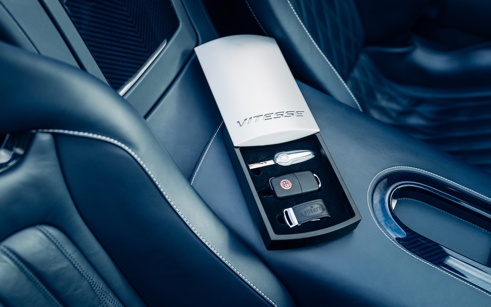 Whilst this example was sold to its first keeper by Bugatti Cannes in August 2014, the 73rd Vitesse was in fact optioned by Bugatti for promotional use in early 2014. Electing to pair Porsche's Carrara White with exposed blue carbon fibre, the interior was optioned in complementing Lake Blue leather with white stitching and fitted with comfort seats and matching blue carbon fibre inserts. The exterior further saw painted intakes and two-tone Supersport wheels.