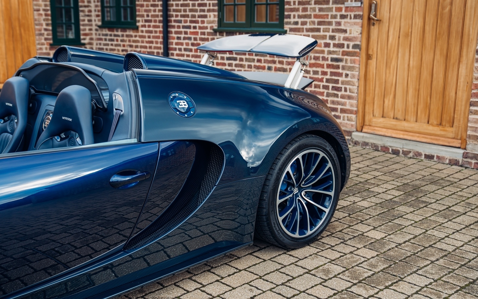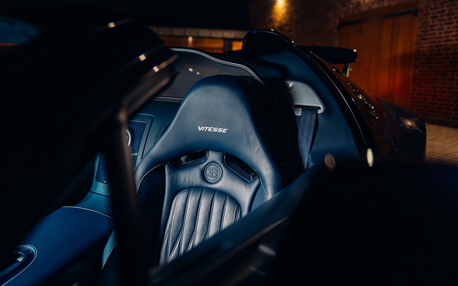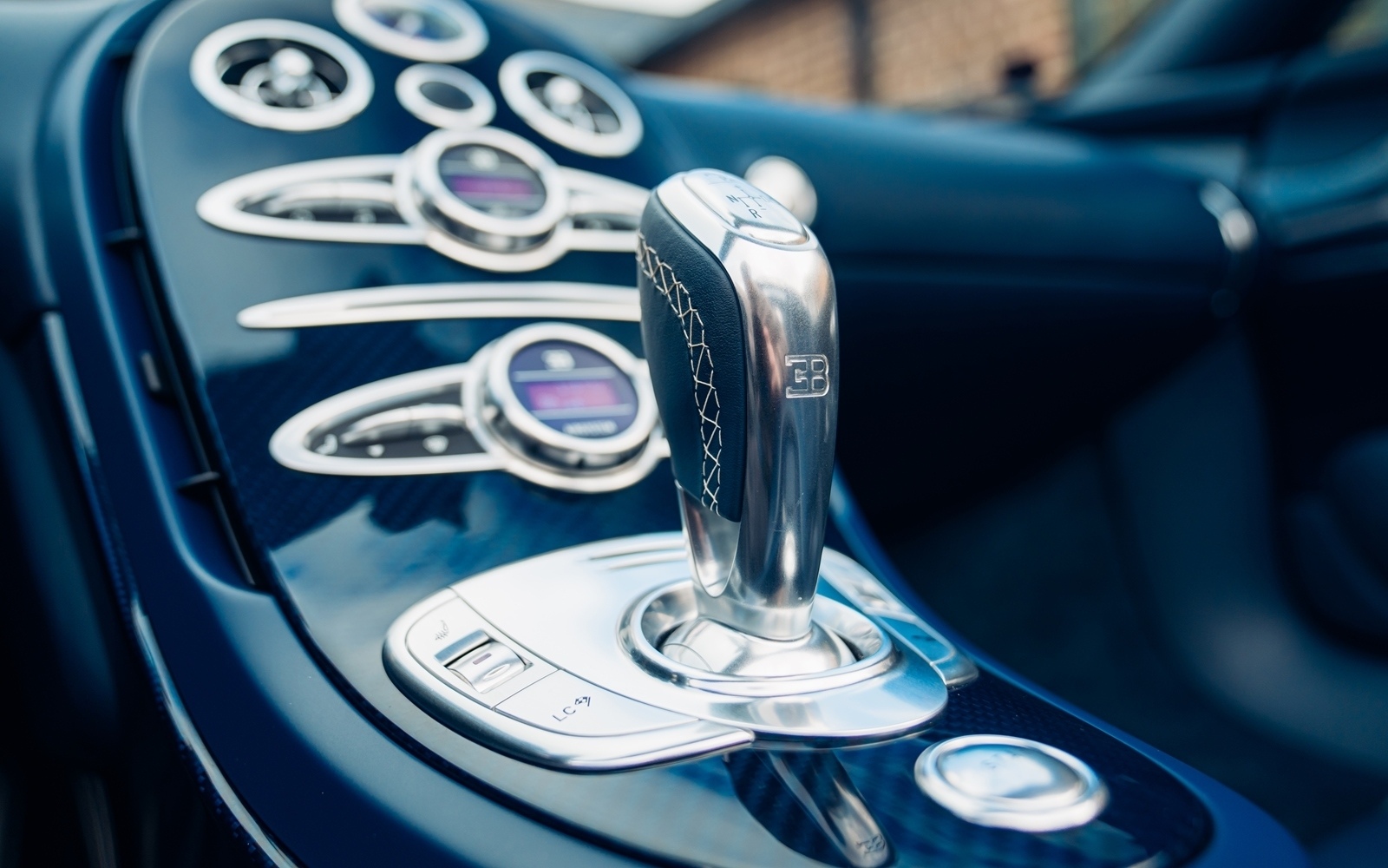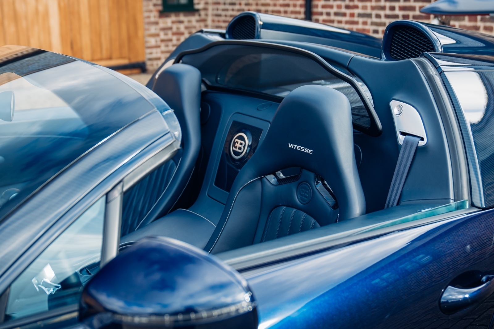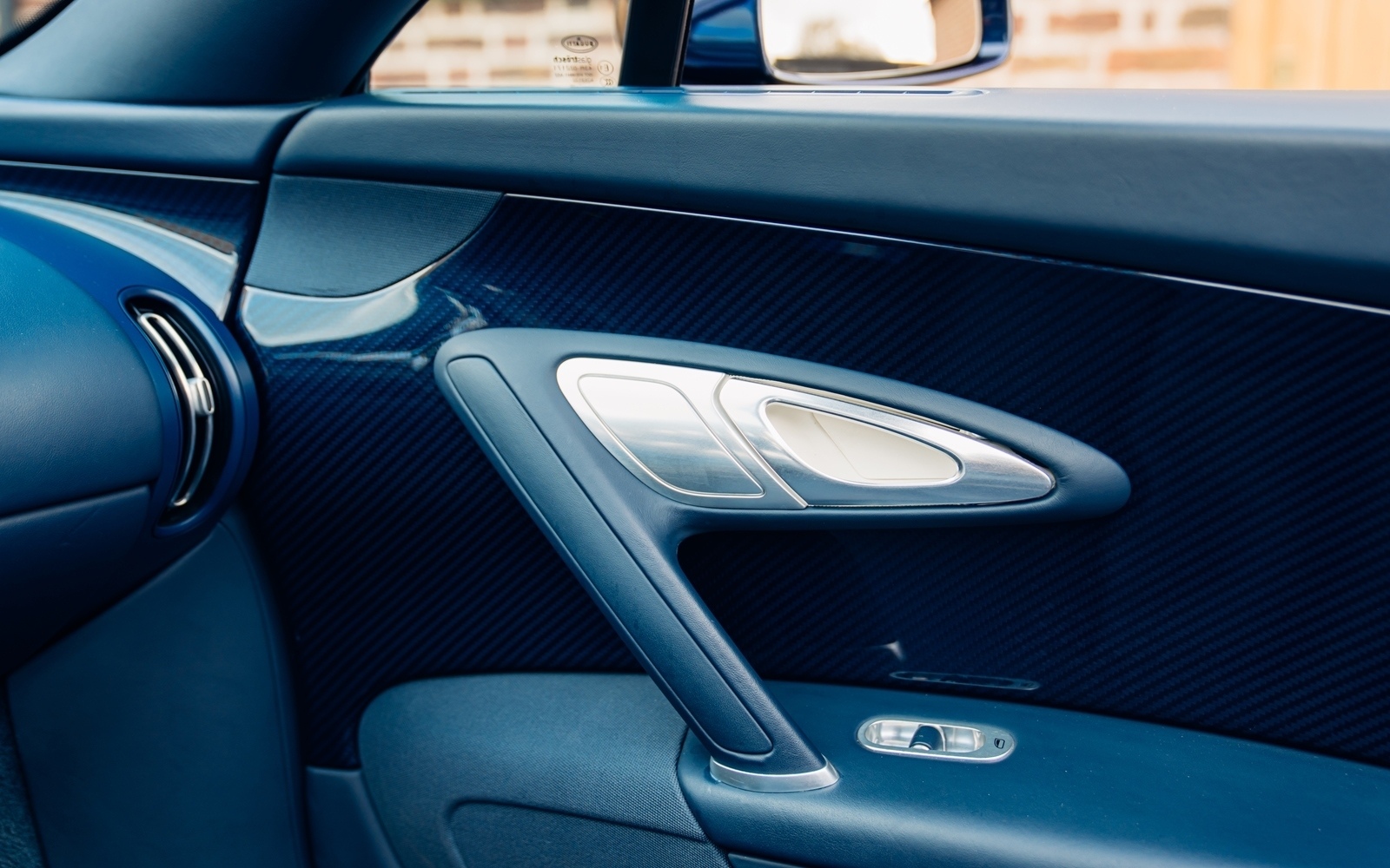 Whilst this example was sold to its first keeper by Bugatti Cannes in August 2014, the 73rd Vitesse was in fact optioned by Bugatti for promotional use in early 2014. Electing to pair Porsche's Carrara White with exposed blue carbon fibre, the interior was optioned in complementing Lake Blue leather with white stitching and fitted with comfort seats and matching blue carbon fibre inserts. The exterior further saw painted intakes and two-tone Supersport wheels.