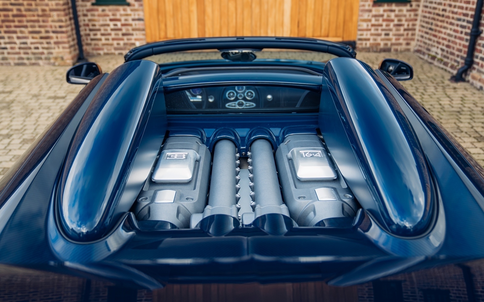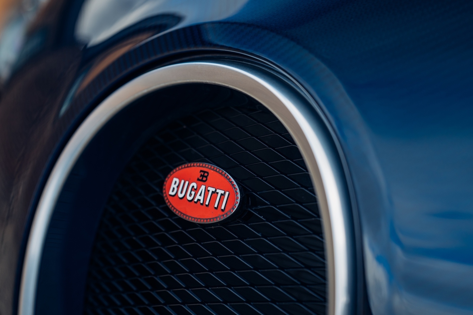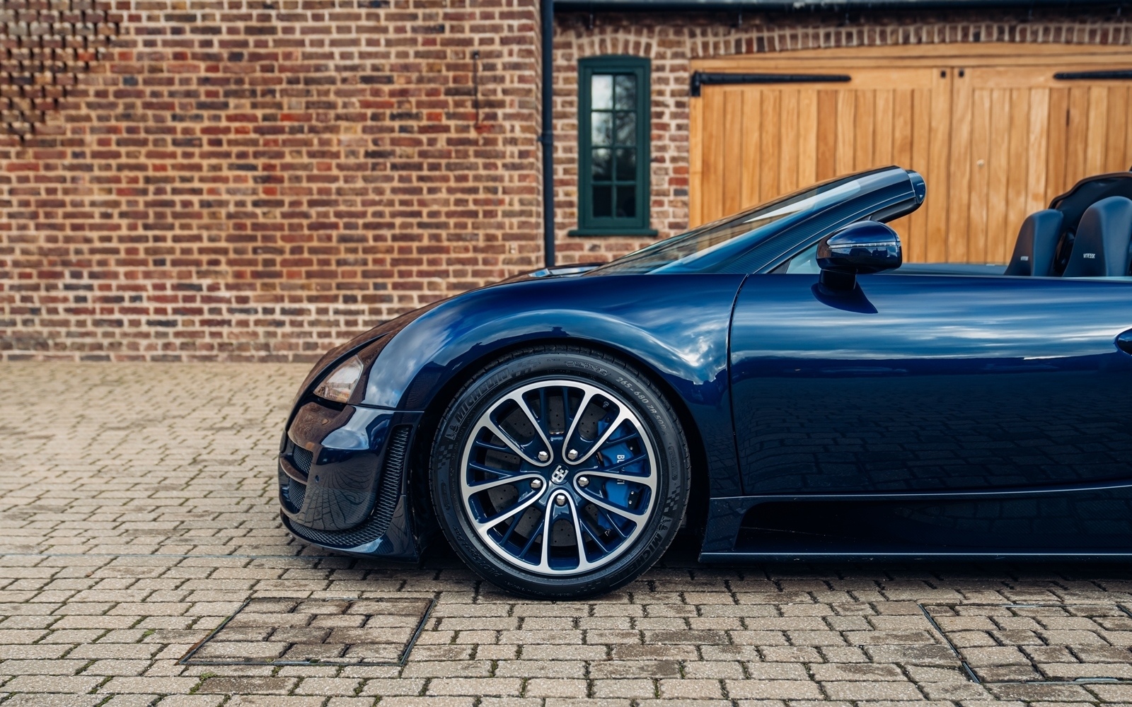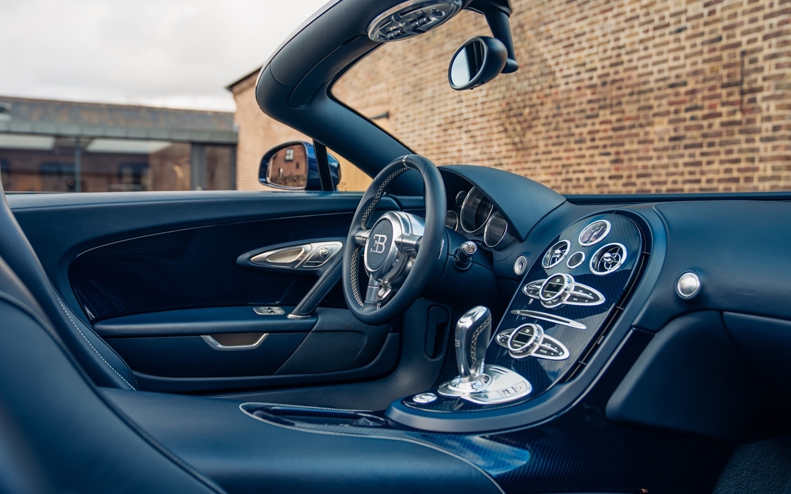 Whilst this example was sold to its first keeper by Bugatti Cannes in August 2014, the 73rd Vitesse was in fact optioned by Bugatti for promotional use in early 2014. Electing to pair Porsche's Carrara White with exposed blue carbon fibre, the interior was optioned in complementing Lake Blue leather with white stitching and fitted with comfort seats and matching blue carbon fibre inserts. The exterior further saw painted intakes and two-tone Supersport wheels.