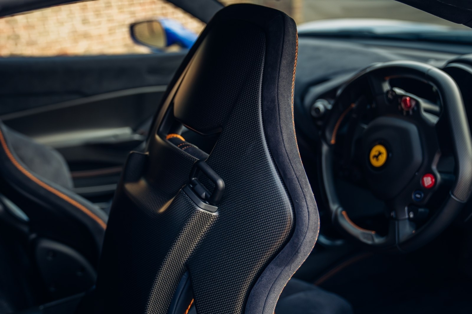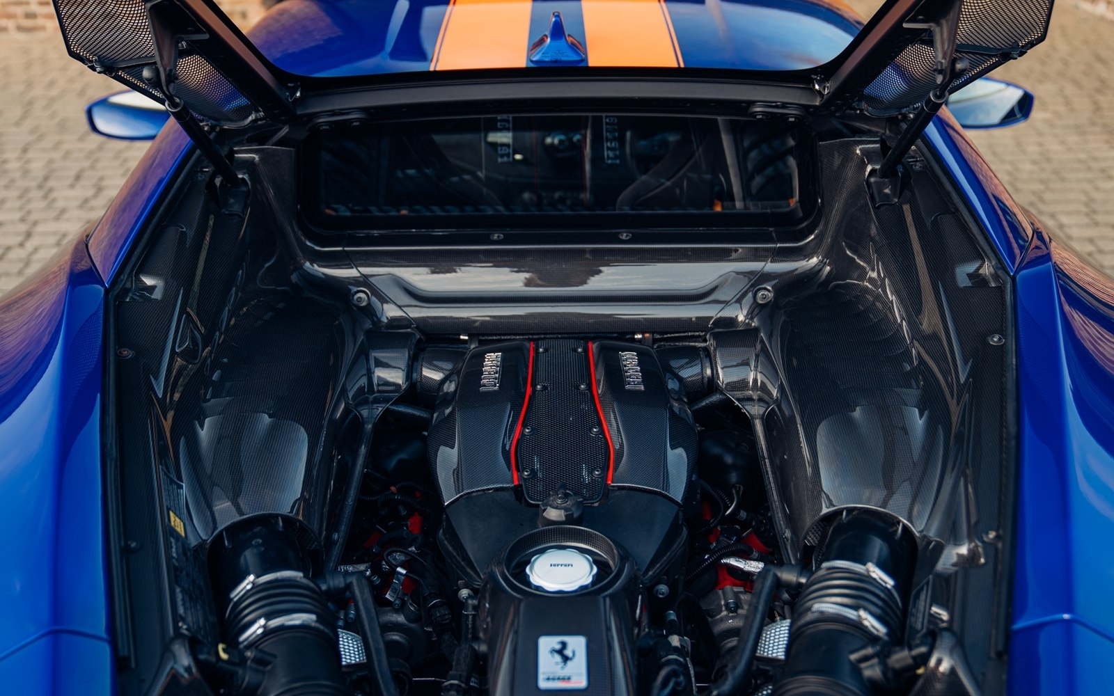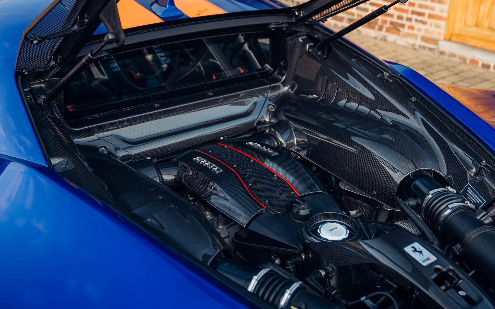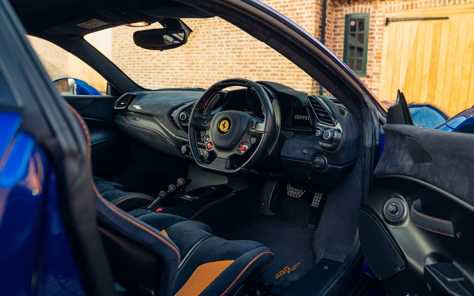 This UK-supplied Atelier optioned car was delivered to its first custodian superbly optioned in Blu Elettrico with the Pista's parallel stripe in Arancio Tristrato. The 20” forged wheels in matte Canna di Fucile cover Nero brake calipers. The inside sees Blu Scuro Alcantara with Cavallinos and all stitching in Extra-campionario Arancione 123 .