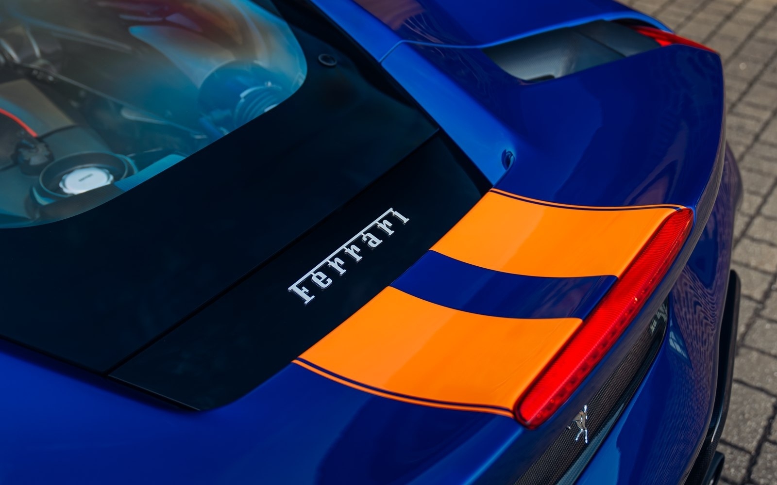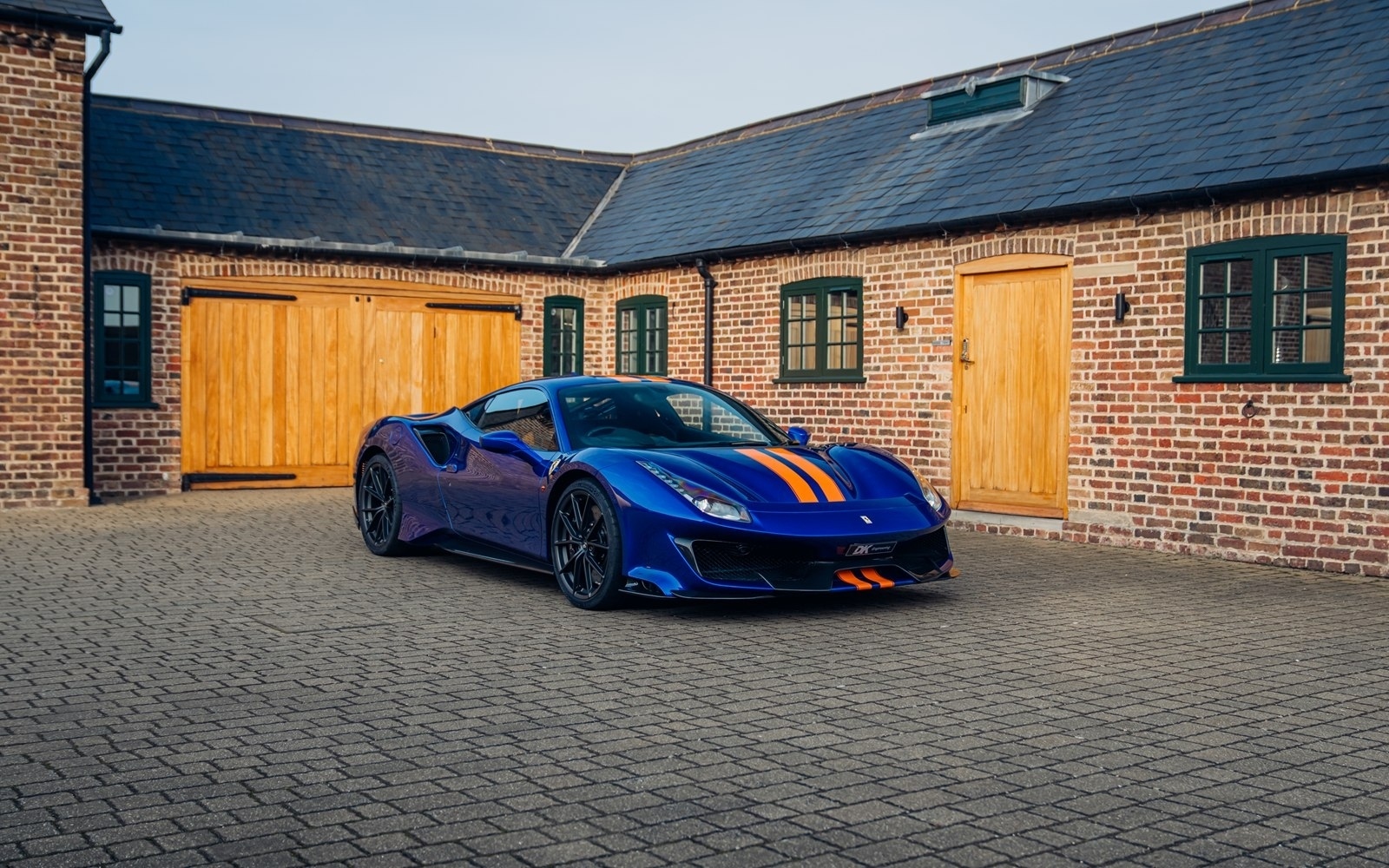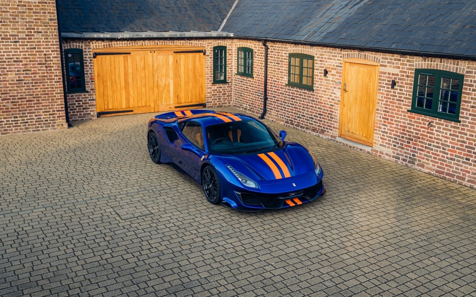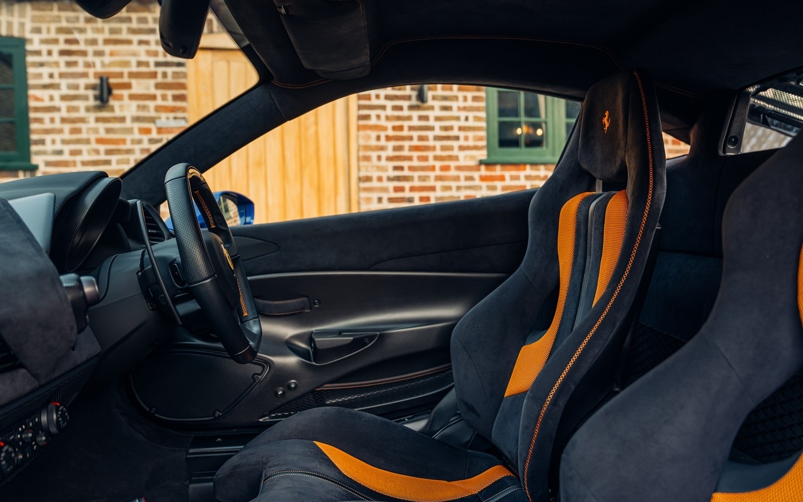 This UK-supplied Atelier optioned car was delivered to its first custodian superbly optioned in Blu Elettrico with the Pista's parallel stripe in Arancio Tristrato. The 20” forged wheels in matte Canna di Fucile cover Nero brake calipers. The inside sees Blu Scuro Alcantara with Cavallinos and all stitching in Extra-campionario Arancione 123 .