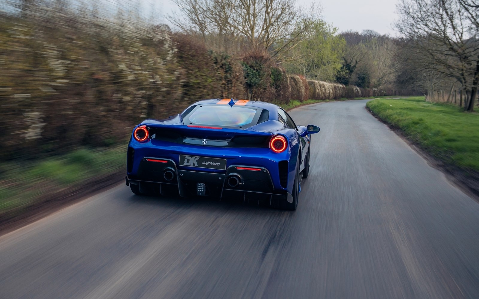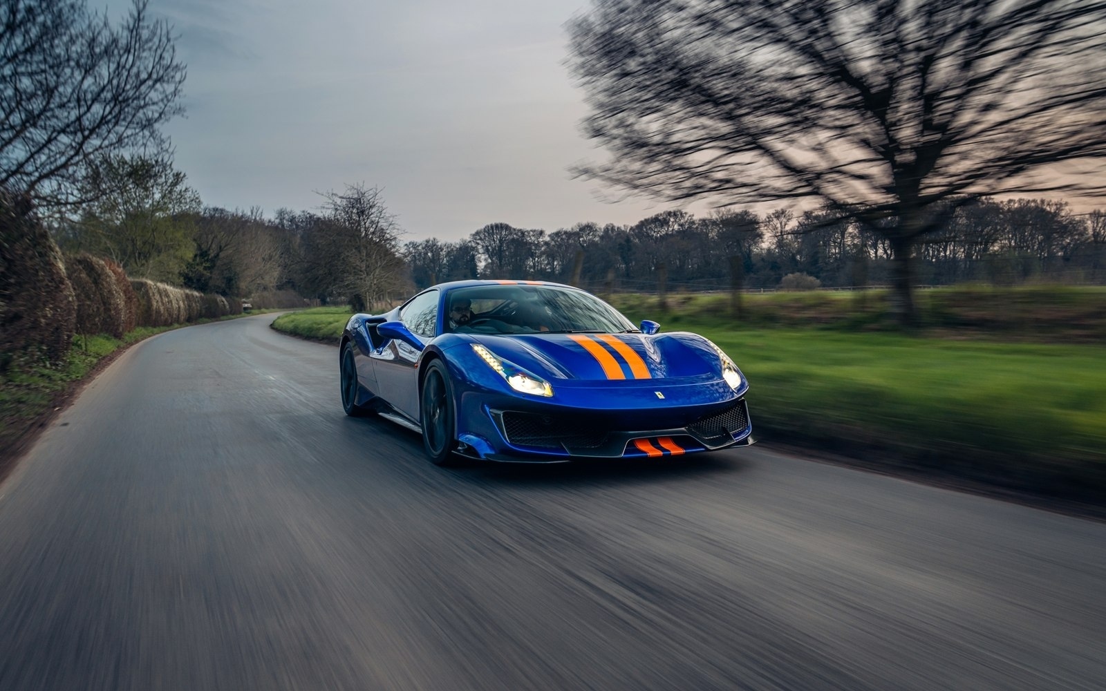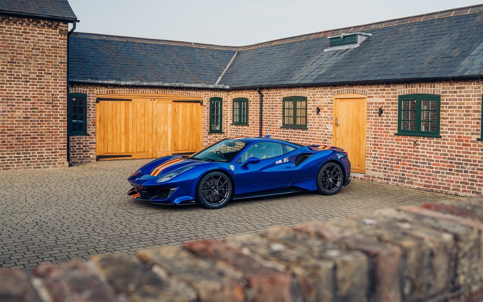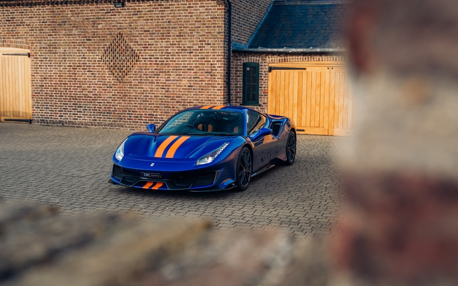 This UK-supplied Atelier optioned car was delivered to its first custodian superbly optioned in Blu Elettrico with the Pista's parallel stripe in Arancio Tristrato. The 20” forged wheels in matte Canna di Fucile cover Nero brake calipers. The inside sees Blu Scuro Alcantara with Cavallinos and all stitching in Extra-campionario Arancione 123 .