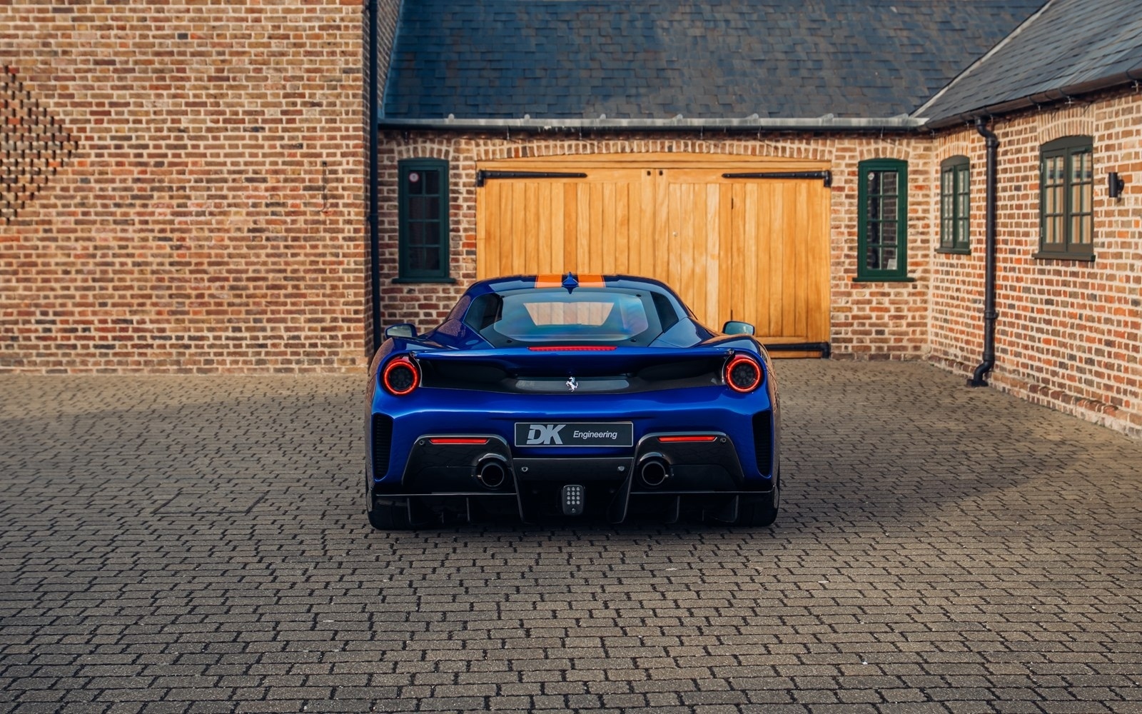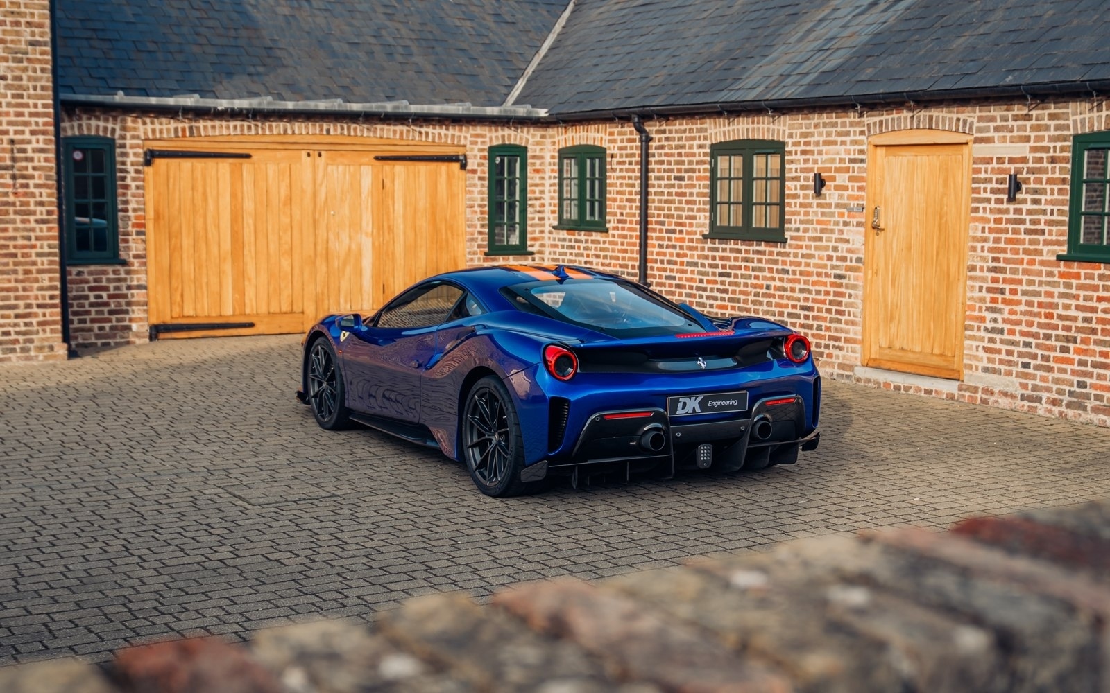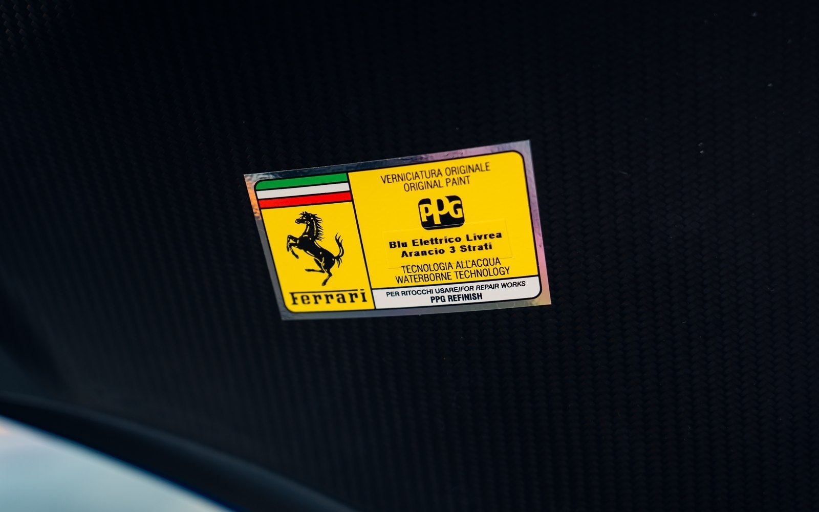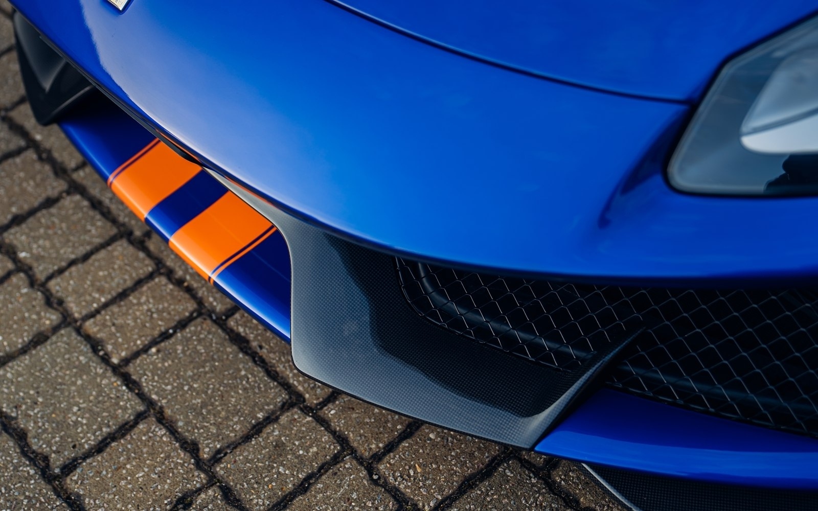This UK-supplied Atelier optioned car was delivered to its first custodian superbly optioned in Blu Elettrico with the Pista's parallel stripe in Arancio Tristrato. The 20” forged wheels in matte Canna di Fucile cover Nero brake calipers. The inside sees Blu Scuro Alcantara with Cavallinos and all stitching in Extra-campionario Arancione 123 .