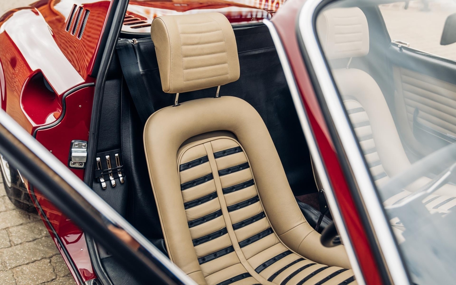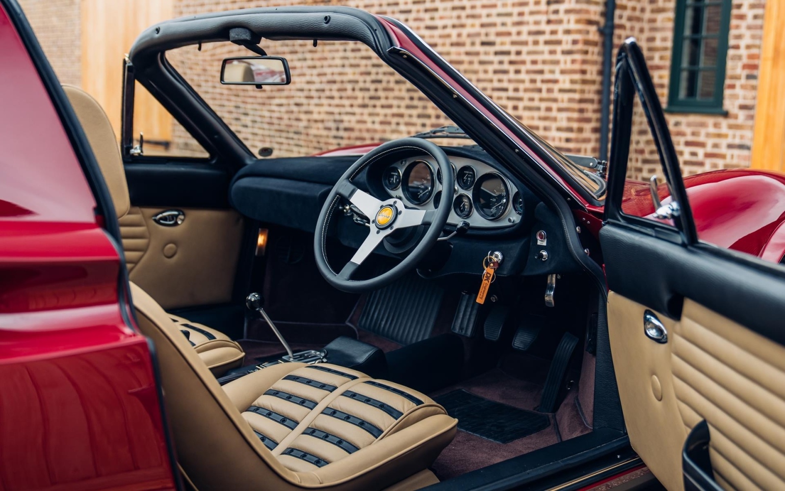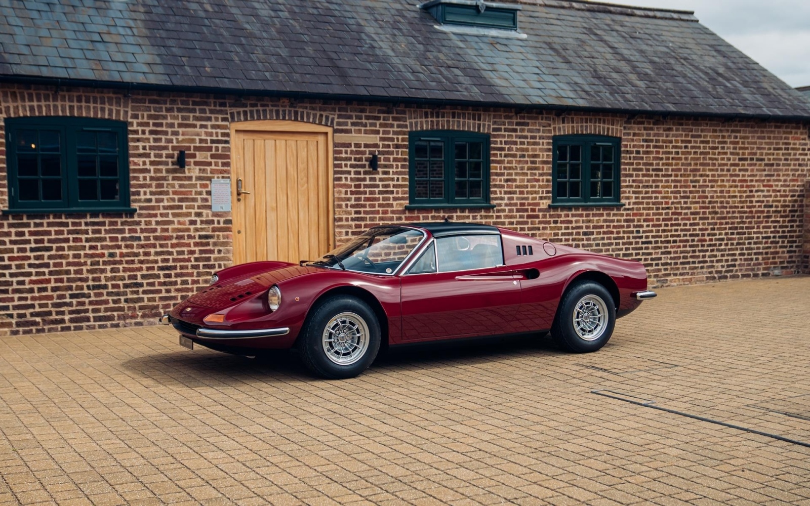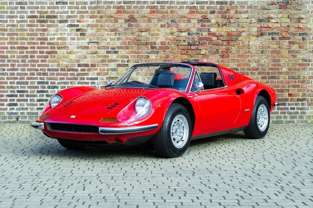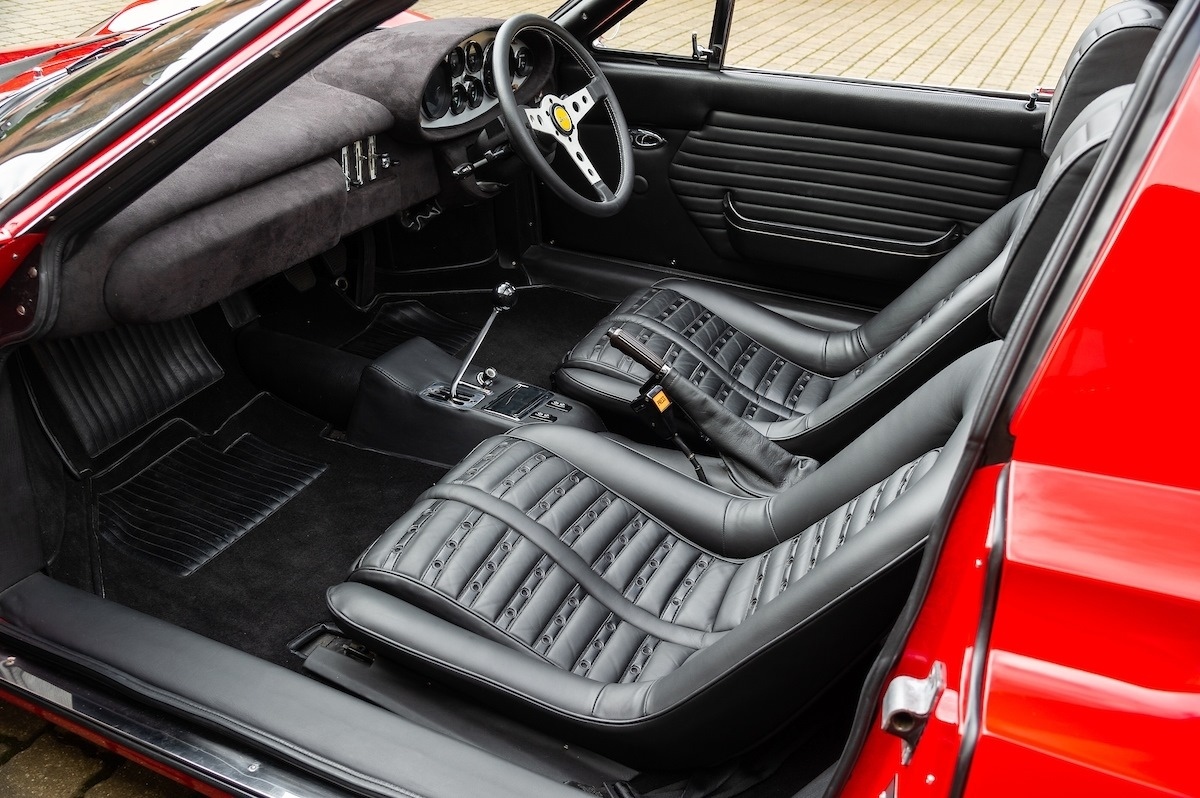 This Dino GTS was supplied new by Maranello Concessionaires and their records show it was first delivered in March 1974 to Mr Thompson. Originally specified in Rosso Bordeaux over Beige, this car was originally specified with electric windows and the addition of both the extremely rare and highly desirable wider, sand-cast Campagnolo alloy wheels, flared arches and the leather ‘Daytona’ seats. As such this example forms the ultimate roof-off, Dino specification; a "Chairs and Flares" GTS, built as one of just 5 UK RHD examples of such.