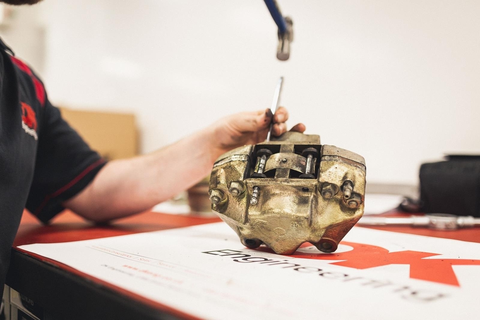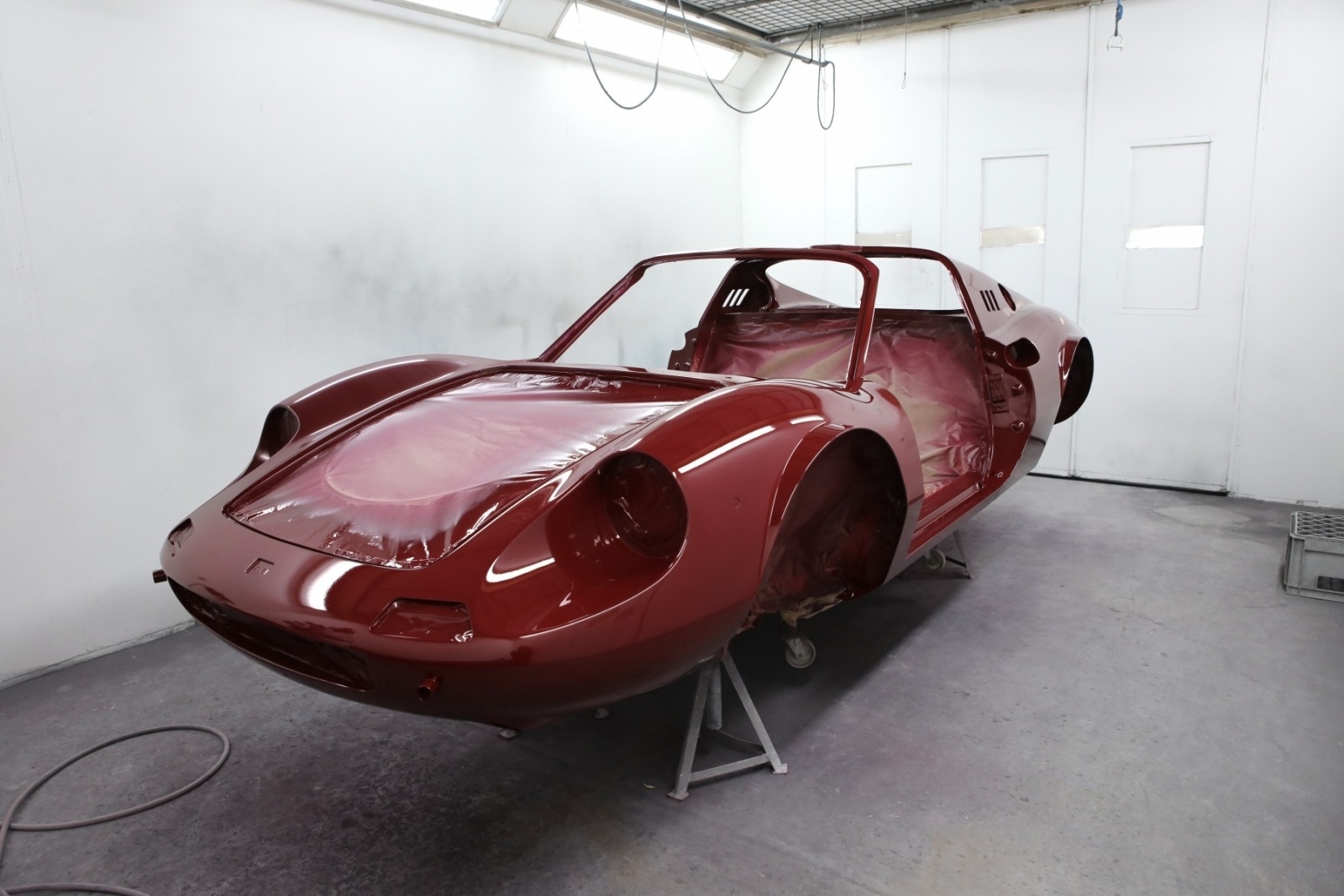 The car was refinished in the original Rosso Bordeaux 20-R-351 Salchi courtesy of Spray-Tec in Northampton before returning to DK for final assembly. During the time the car was away for paint, the engine received a comprehensive rebuild at DK, ready to be installed upon its return. After test fitment of the chrome work, the bumpers and window surrounds were sent off to be chrome plated.